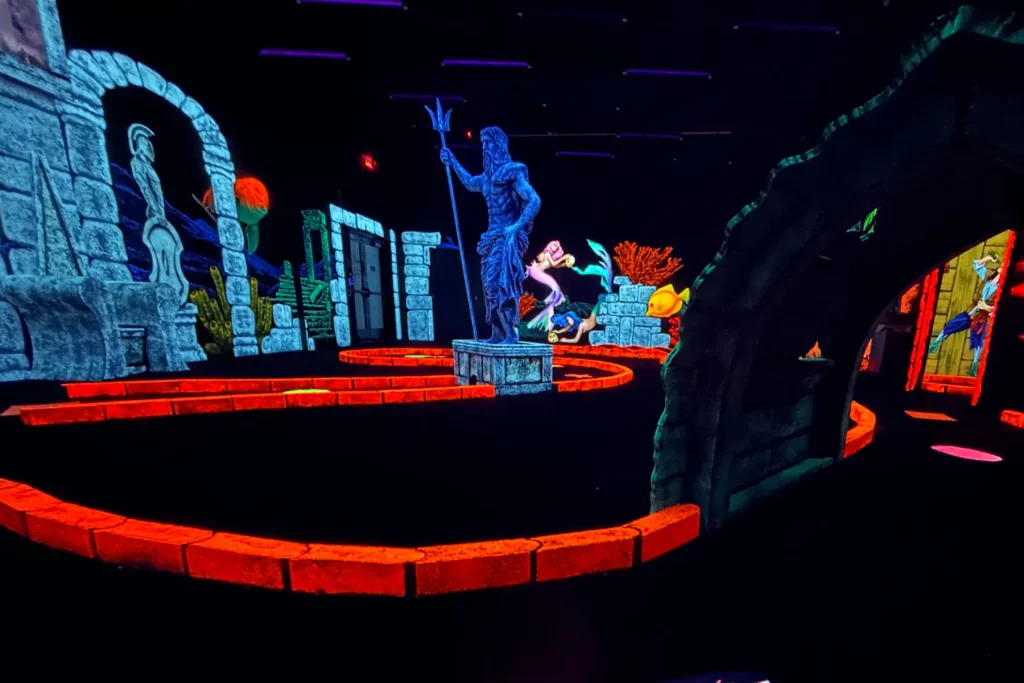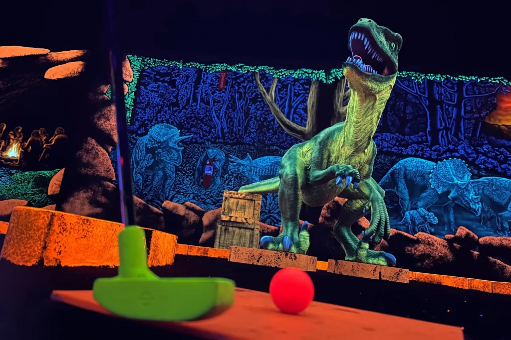 Step into Portal 14 and travel back 65 million years! Explore 9 holes of glowing mini golf through 1,900 sq ft of blacklight-lit prehistoric adventure. The age of dinosaurs is waiting — are you ready to roam?
